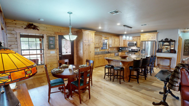 Welcome to this meticulously maintained luxury log home, nestled in a serene green setting surrounded by evergreen trees. Energy-efficient spray foam insulation & permanently installed generator. Brand new air conditioner! Grand, high vaulted ceilings create an airy feel, while a stone floor-to-ceiling, wood-burning fireplace, serves as the focal point of the great room kitchen & dining rooms. Stunning new oak floors, knotty alder cabinetry, and granite countertops add elegance. Chefs will enjoy the 5-burner gas range. The primary suite boasts dual sinks, a large tile shower, and 3 walk-in closets. Two additional bedrooms offer versatile living options, one with a Murphy bed. Enjoy outdoor entertainment on the wrap-around porch and screened-in patio. The Xeriscaping & backyard fire pit invites gatherings under the stars. Extra wide three-car finished, heated & cooled garage expands entertaining space. Experience luxury living in this meticulously crafted log home, where every detail exceeds expectations.